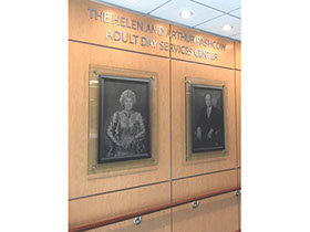 The second naming opportunity was a unique mix of cut letters “THE HELEN AND ARTHUR PASHCOW ADULT DAY SERVICES CENTER” and photos taken of historic oil paintings and then printed onto photo embedded metal panels and affixed to glass backers. The Pashcow family were founding donors to ACLD and so the choice to use cut letters and photos was warranted.