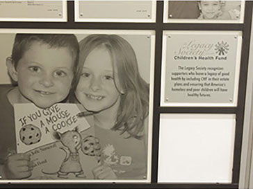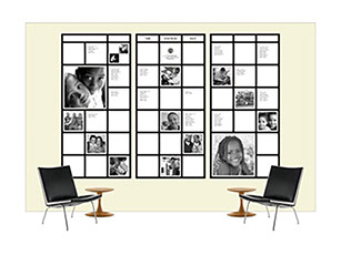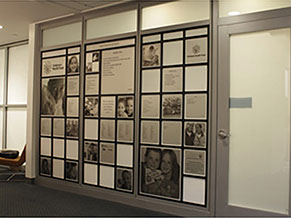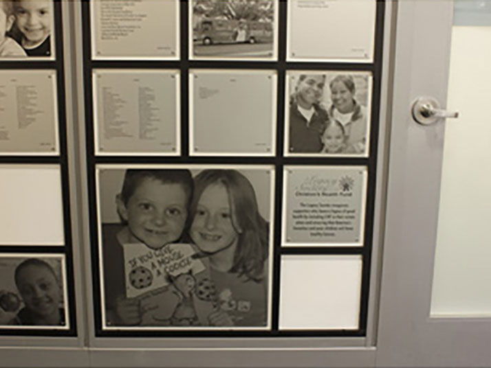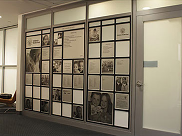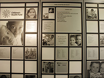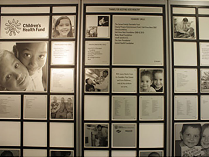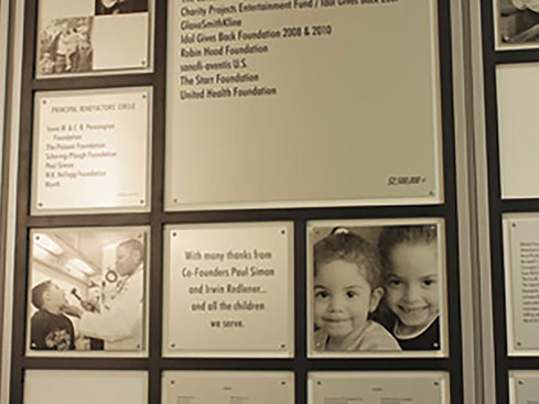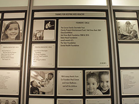 Solution: Since our client also wanted high brand awareness we turned to our unique line of DonorMurals™ (also see Girls Inc.). Using two sizes of metal squares we created a grid of photographs and donor plaques. The beauty of the system is that any plaque can be replaced with just 4 screws. A 10 to 14 panel update takes under 1/2 hour and new looks are created by simply changing the photographs. All the plaques are created using our photo embedded metal process in this 100% “green” installation.
