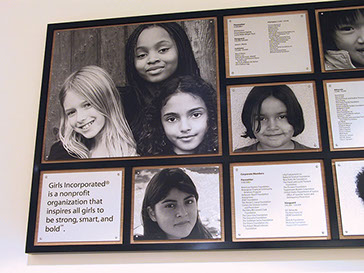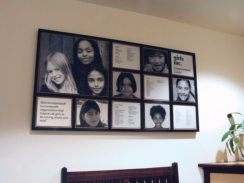 Solution: Like many of our works, brand identity is best captured in one of our DonorMurals™. Girls Inc. provided us with a wealth of photography from their archives. We cut and cropped the photos until we had a set of images that uniquely and impressively told the Girls Inc. story. The enhanced images and donor lists were then all manufactured in photo embedded metal plaques. A three dimensional wood back board and raised lattice finished off the installation.