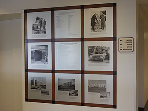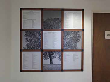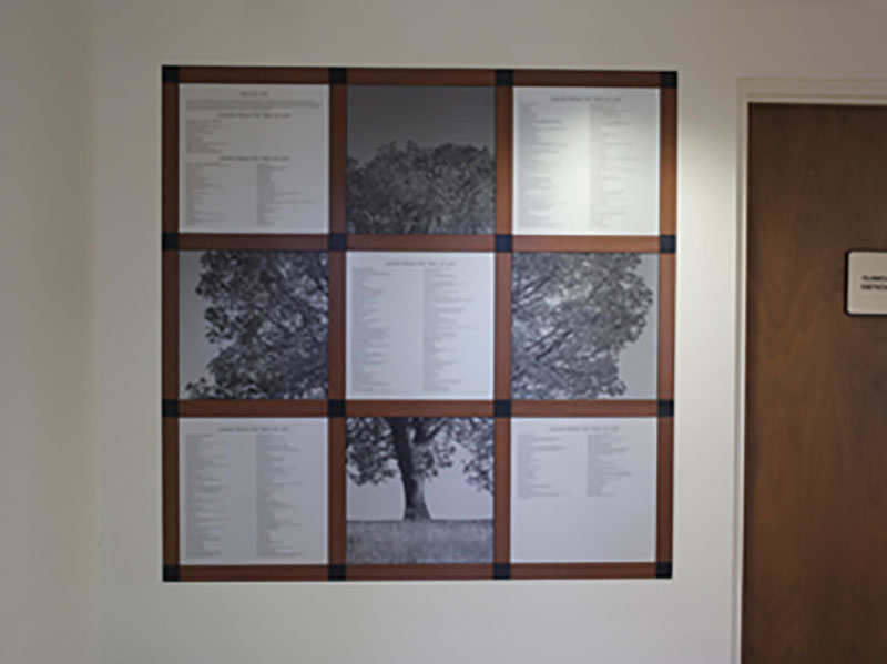 Project: To use the existing architectural wood grid and create a high visibility recognition system honoring past donors, future donors and the history of the hospital.