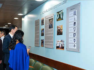 Solution: Our choice was to use a multitude of images to make the installation eye catching and storytelling. We collected images of the recipient and images of the event honoring him. In addition, we added a panel with names and photos of the hospital’s medical directors. All the panels were printed using a special metal printing process that replicates text and images in museum quality. A set of metal cut letters above the panels identified what this installation was for.