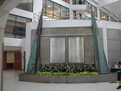 Solution: For this solution we utilized a large sculpture in our client’s second floor main atrium. We added two etched stainless steel plaques, each measuring 3 1/2' wide x 6 1/2' tall. The stainless plaques were trimmed in a dark green border to draw attention to them. What makes this installation so very effective is the sheer size and scope of the etched pieces and the surrounding scale of the sculpture.