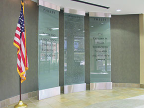 Both projects consisted of deep carved sand blasted glass and stainless steel accent elements. The first set of donor walls were free standing and the second set were wall mounted. All of the donor plaques were sand blasted glass over metal logo panels. The look is quite exceptional and we give major kudos to the designing artist.