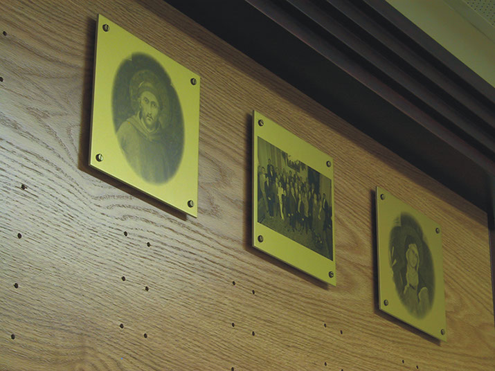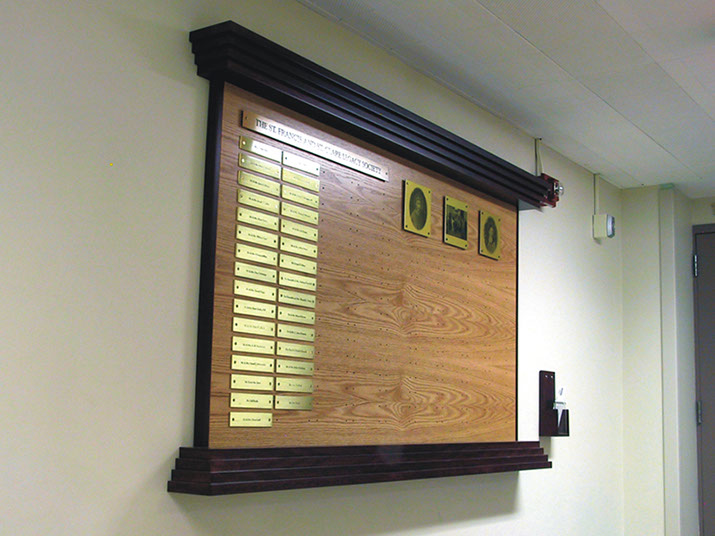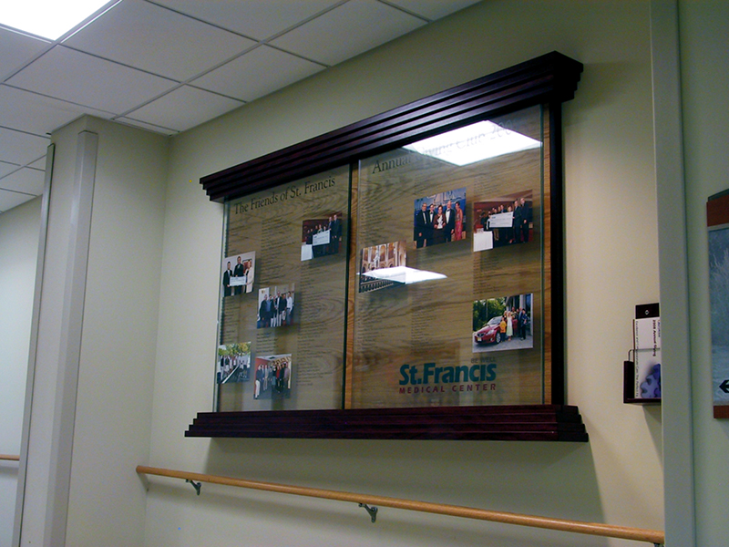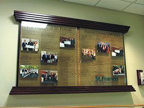 Solution: When we designed these donor walls for St. Francis they had been our client for over 10 years. This project was the fifth one we undertook for them. By this time we had established standards in place. We understood their look as traditional with a modern bent. We proceeded to create two updateable donor walls with printed acetates and photography. The major donors Legacy wall was brass plaques on a wood frame and 3 photo imbedded metal images. The two annual walls face each other in a pass-through hallway that leads into a major corridor where the Legacy wall is mounted. The experience of the three walls is quite impressive and expresses the vast donor support St. Francis enjoys.