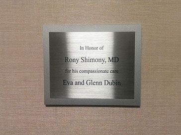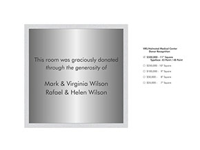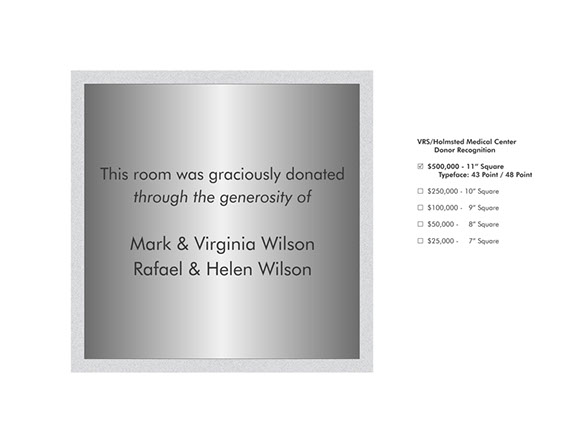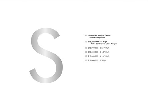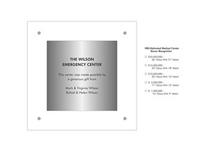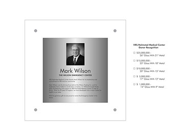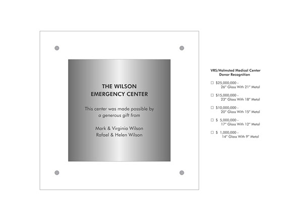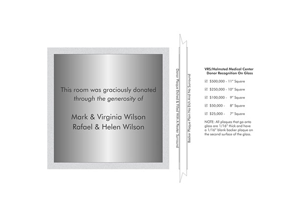 What we create are design plans that include plaques, cut letters and bio-plaques matched to the table of gifts that our clients have put in place. Just having a table of gifts does little for donors if they cannot see what they will get for their gift. Our plans list with visuals what a donor gets for a given donation — this helps donors get a sense of the return for their generosity. Our clients say these Standard Plans help them close donations with lot less hassle and with predictable outcomes for the donor and the non-profit. Having a format for all naming opportunities insures a coherent and elegant look when the naming opportunities finally go up. Having a plan in place also saves staff time.
