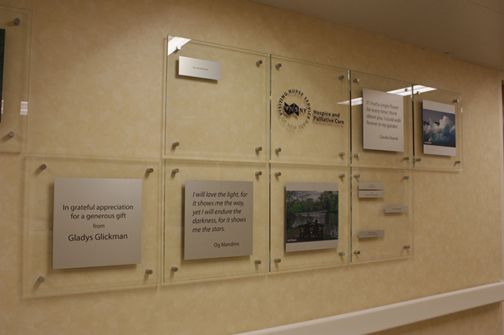 In close coordination with the Hospice Fundraising Manager we designed a unique non-static donor recognition system. As you view the design you see the Visiting Nurse Service of New York logo carved into glass and color filled in the exact color match of their logo, small and large metal plaques honoring donors that give to this much needed New York City project and photos and quotations that create a soothing environmental feel. The donor plaques and the logo are permanent. Everything else is magnetically attached for easy removal.