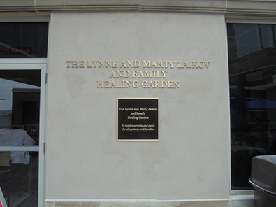 Solution: While the recognition had to be significant it also had to be peaceful. Our choice was bronze letters and a reverse etched bronze plaque. The bronze color and softness of the golden hue accomplished the feeling of peace and calmness, supporting the sense of healing as is the intent of this garden. The materials used are specially finished to resist the elements, since the recognition is installed outdoors.