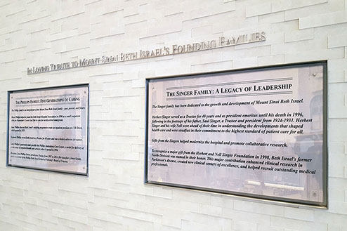 The design you are looking at is a multi-leveled recognition. Level one is sand blasted glass with a tribute to each family engraved into each panel. The panels are then set atop a reworked image from the center’s past. From an array of possible images, two were chosen that represented this center’s history the best. The photos were also chosen based on their quality for reproduction. The next step was “ghosting” each image so that you could make out the image yet still be able to read the overlaid text — it worked perfectly. Although the photos on our site look like reflections in glass they are actually “ghosted images” on metal set behind the engraved glass face panels.
