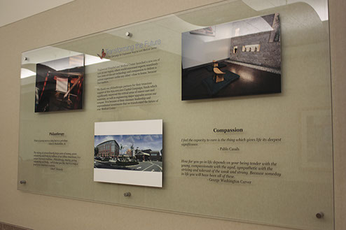 Glass offers many opportunities to create beautiful and elegant signage — donor and other. It is a classic material that works well up and into the modernist field of design. There are many ways to work with glass: sand blasting, adhering images, printing inside the glass, using as an overlay, indoor applications and exterior applications to name a few. In all of it’s forms it speaks of fine design.
