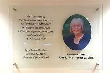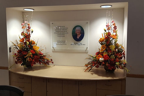 Solution: Since our client had a wonderful photograph of this honoree, we made it the highlight of the piece. We were provided with text that was etched into a tempered glass panel and then we created a full color photo embedded metal plaque that was affixed in place on the glass panel. While the outcome of the plaque itself is stunning, the placement in the lit alcove makes it definitely a recognition centerpiece.