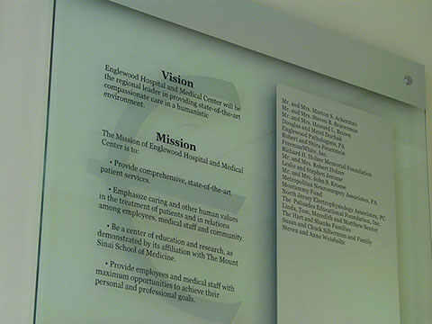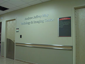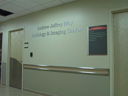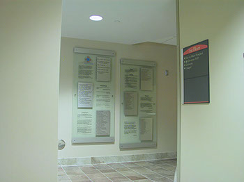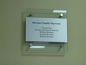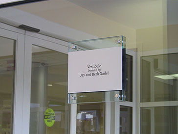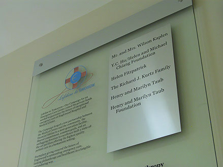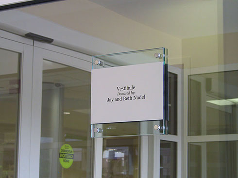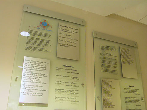 We used metal cut letters for the largest of donors and a series of size graded plaques for the rest of the naming opportunity donors. The donor wall was created using sand blasted glass and magnetic metal panels. To allow our client to update easily, the donor names were placed on the magnetic metal panels. The sand blasted glass included logos and famous quotes. Using the same glass and metal theme we created a physicians’ wall and a community donors’ wall to round out the system.